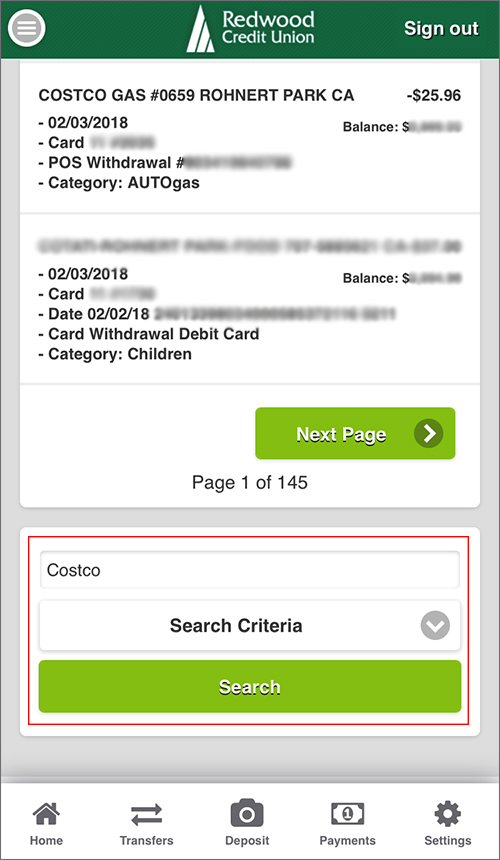 In this example we did a search for all "Costco" transactions.